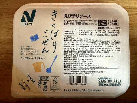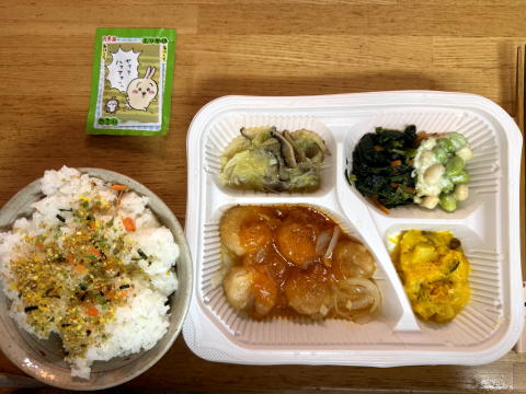 夜は ニチレイフーズダイレクトの健康管理食(えびチリソース)、ちいかわふりかけでした。