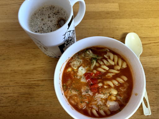 朝は ファミマの フジッリ(ショートパスタ)のミネストローネ、コーヒーでした。