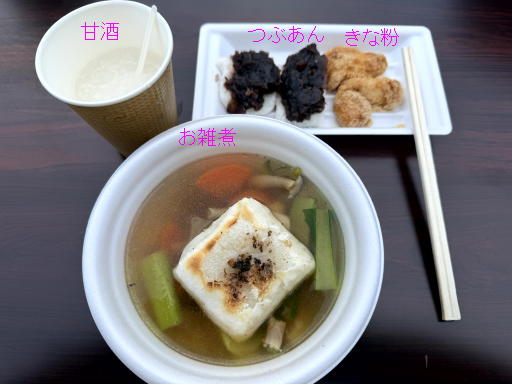 つきたてのお餅は、海苔を巻いた磯部、きな粉、つぶあんの3種類ありました。さらに焼いたお餅で、お雑煮も配られて、甘酒もふるまわれました。