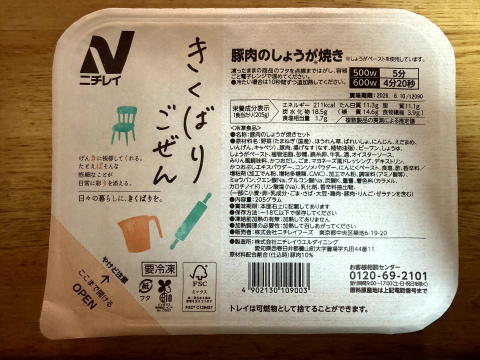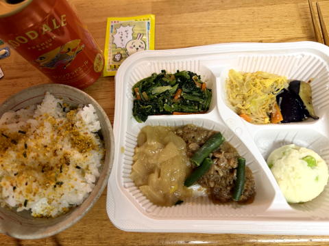 夜は ニチレイフーズダイレクトの健康管理食(豚肉のしょうが焼き)、ちいかわふりかけでした。