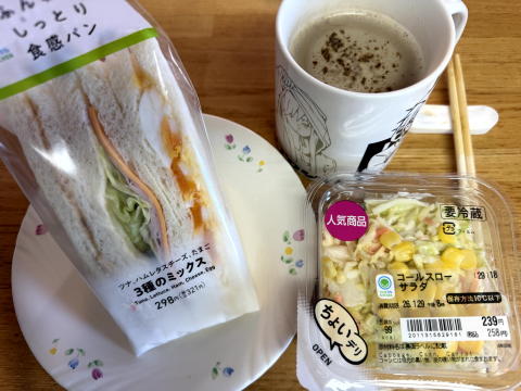 朝は ミックスサンドイッチ、コールスローサラダ、コーヒーでした。