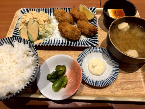 昼は、近所の定食屋で カキフライ定食(950円)でした。