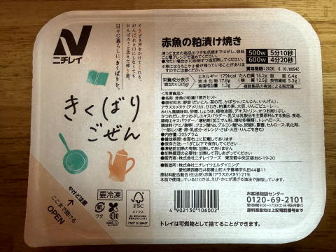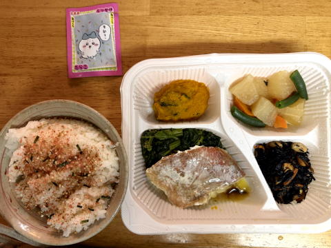 夜は ニチレイフーズダイレクトの健康管理食(赤魚の粕漬け焼き)、ちいかわふりかけでした。