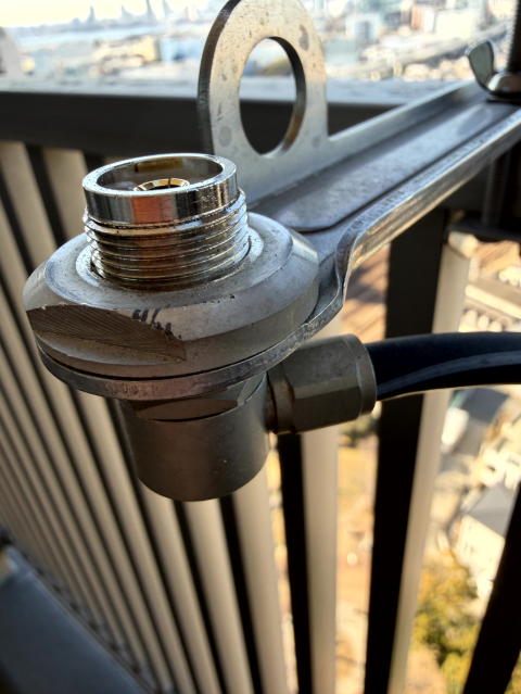 アンテナ基台にケーブルを取り付け。ケーブルが太いのでゆるやかに曲げないと折れますので慎重に。
