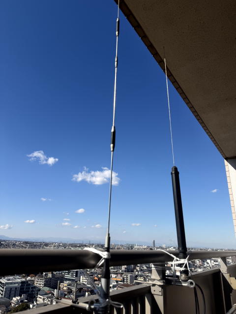 HF用のアンテナ(黒)のほうが短く見えますが、モータードライブで 1.5倍くらいに伸びます。