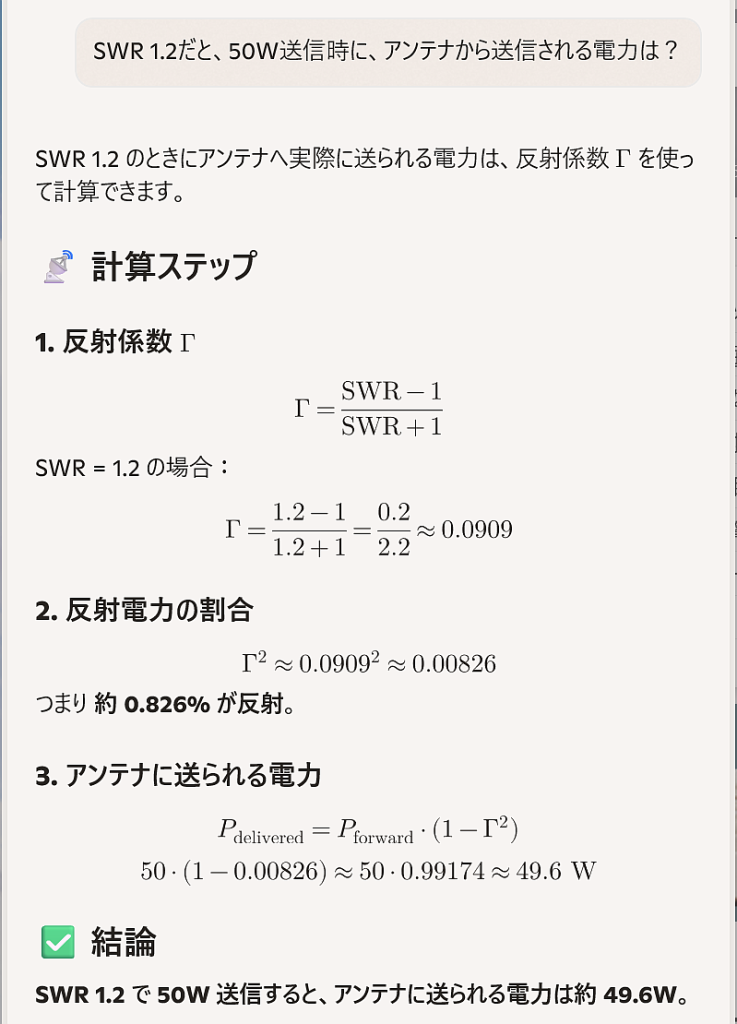 0.4W少なくなりますが、誤差のうちでしょう。ちなみに SWR=3.0だと、無線機から 50W送信しても、アンテナからは 37.5Wしか電波が出ません。こういう計算をしたうえで、お財布と相談してケーブルを着ます。