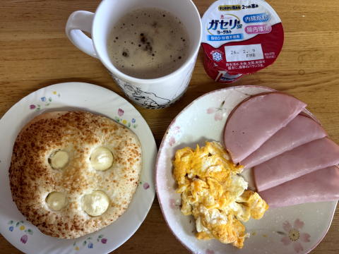 朝は チーズ塩パン、ハムエッグ、コーヒー、ヨーグルトでした。