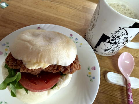 朝は フライドチキンバーガー、コーヒーでした。