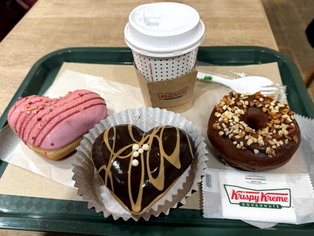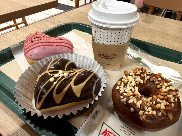 お昼は クリスピー・クリーム・ドーナツ(KKD)で、ハート形のフォンダンショコラ(温め)、他、バレンタイン限定ドーナツ(ピンクのハート、カラーチョコ・スプレー)、ブレンド(S)でした。
