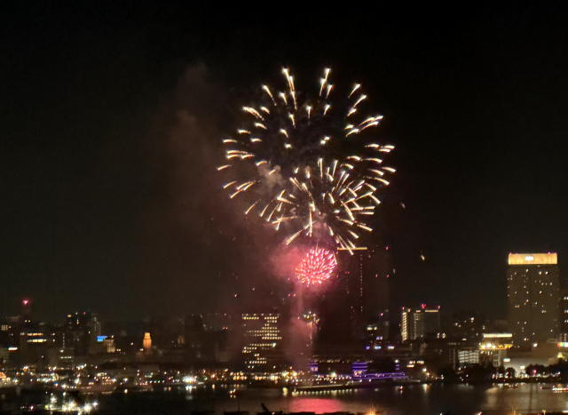夜、みなとみらいの新港埠頭あたりで、花火が打ちあがっていたので、ベランダからスマホで撮りました。