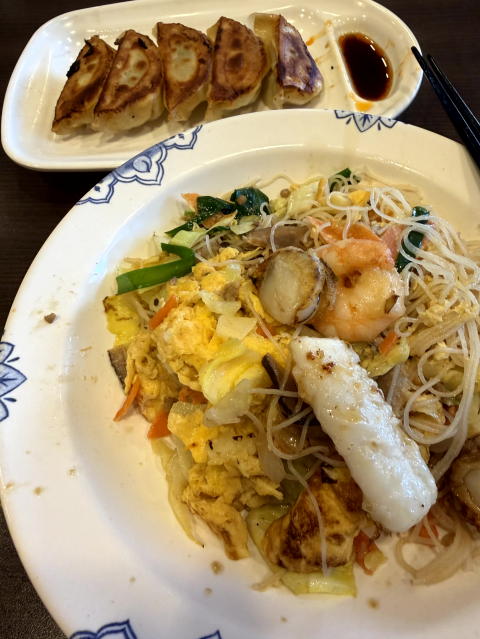 お昼は バーミヤンで海鮮焼きビーフンと焼き餃子(5個)でした。