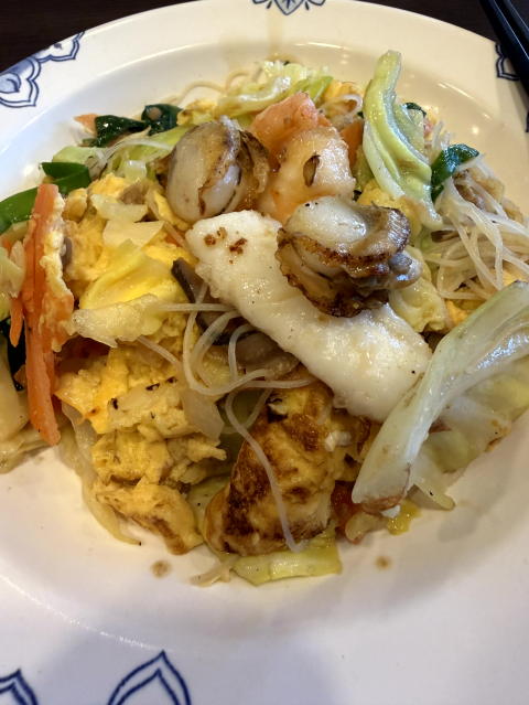 お昼は バーミヤンで海鮮焼きビーフンと焼き餃子(5個)でした。