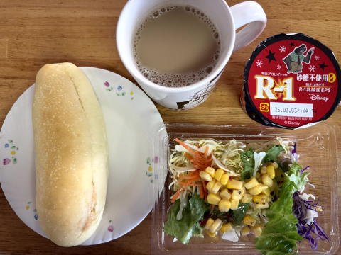朝は コッペパン(ピーナツクリーム)、コーンサラダ、コーヒー、砂糖不使用ヨーグルトでした。