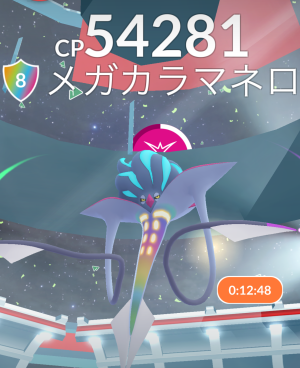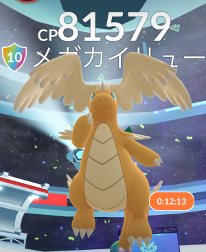日曜の駅前ということで、どこのジムへ行っても、ロビーが 20人満員でレイドバトルがスタートする感じで、大半が TL70以上でメガ進化です。なので、今回から追加された「スーパーメガ進化ポケモン」のレイドも秒殺で倒して、ゲッチャレ1球目でゲットでした。
