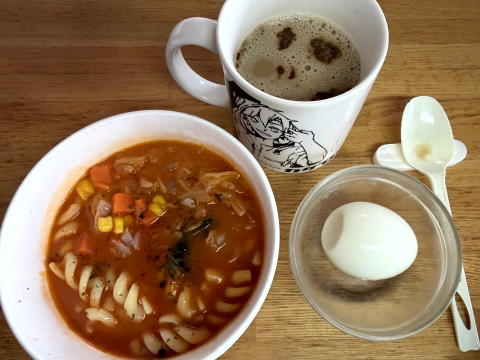 朝は、ベーコンと野菜のトマトクリームスープ、ゆでたまご、コーヒーでした。