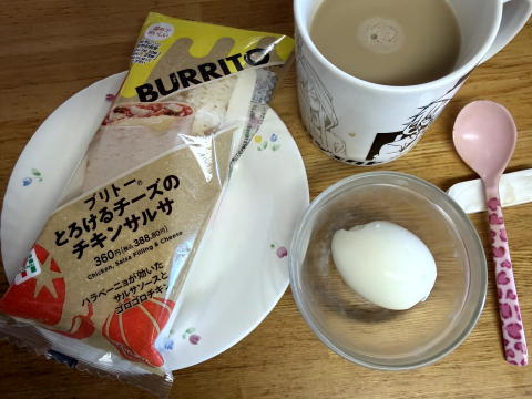 朝は、ブリトー(とろけるチーズのチキンサルサ)、ゆでたまご、コーヒーでした。