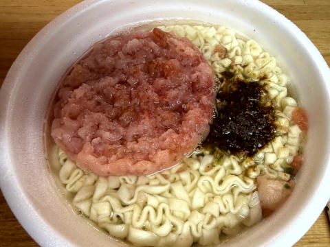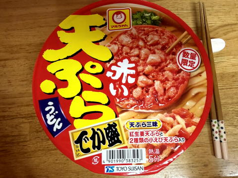 夜は、カップ麺「赤い天ぷら うどん でか盛」(数量限定)でした。