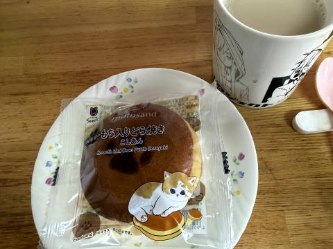 朝は、食べ忘れていた、ねこの日 肉球 もちいりどら焼き、チャイラテでした。