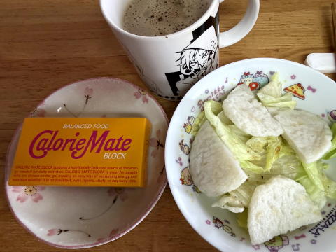 朝はカロリーメイト、サラダ&さつまあげ、コーヒーでした。(要するに 冷蔵庫の残り物で済ませた)
