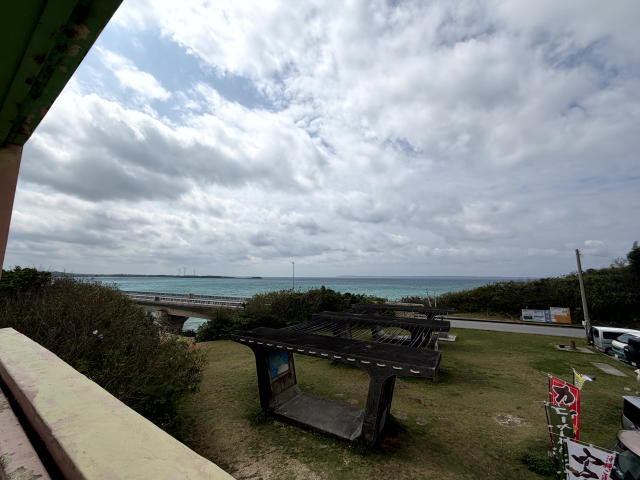10:00にチェックアウトして、ツアーメンバー全員で池間島までレンタカーでドライブしました。宮古島本島と池間島は長い橋でむすばれており、池間島側にある売店の屋上が展望台になっています。