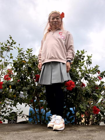 売店でハイビスカスの髪飾りを買って、ベレー帽につけました。プリーツミニスカートは、ハニーズのインパン付きです。