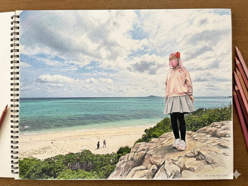 きのうのブログにアップした、宮古島コーデのデッサン画ですが、背景が宮古島らしくないので、実際に宮古島(宮古島本島に隣接する池間島)で撮った写真を背景にしてたデッサン画を Nano Banana 2で作りました。