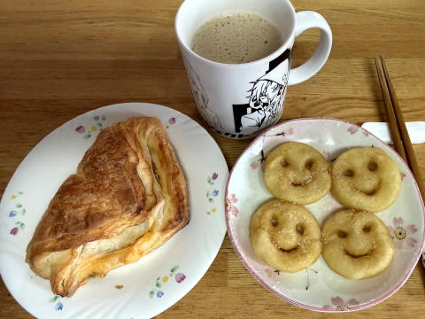 朝は ハムチーズクロワッサン、フライドポテト、コーヒーでした。