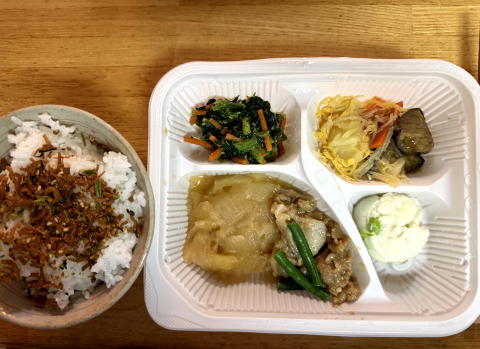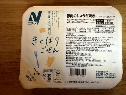 夜は、ニチレイフーズダイレクトの健康管理食(豚肉のしょうが焼き)、ちりめんふりかけでした。