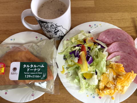 朝は、タルタルハムドーナツ、サラダ+ビアソー、コーヒーでした。