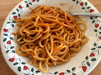 そのあと、お昼は、冷凍の もちもち太麺ナポリタンでした。