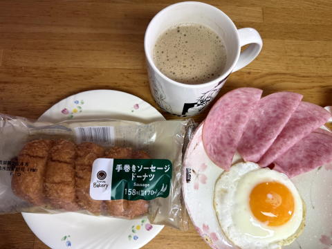 朝は、手巻きソーセージドーナツ、ハムエッグ、コーヒーでした。