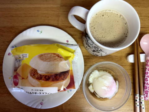 朝は、グリルドポークマフィン、温泉卵、コーヒーでした。