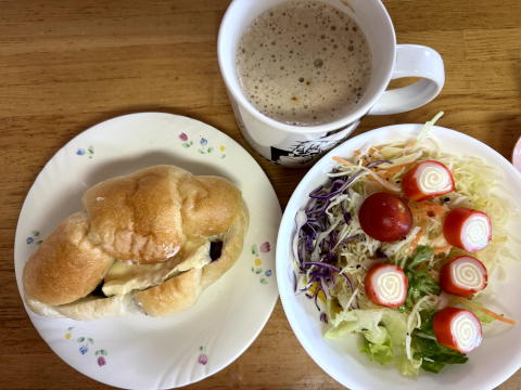 朝は、あんバターサンド、サラダ+チーズインカニカマ、コーヒーでした。