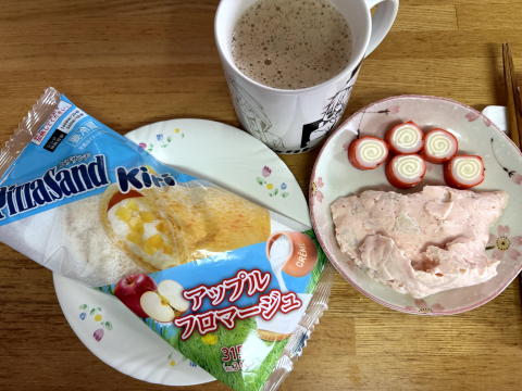 朝は、ファミマで新発売の ピザサンド Kiri アップルフロマージュ、明太ポテサラ+チーズインかにかま、コーヒーでした。