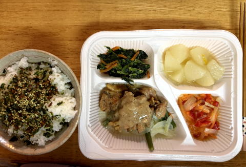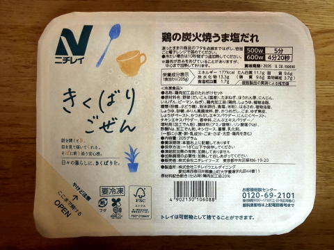 夜は、ニチレイフーズダイレクトの健康管理食(鶏の炭火焼うま塩だれ)、海苔わさびふりかけでした。