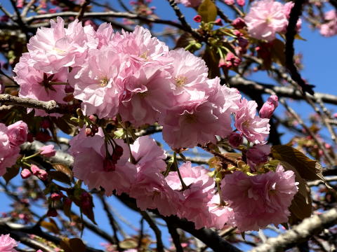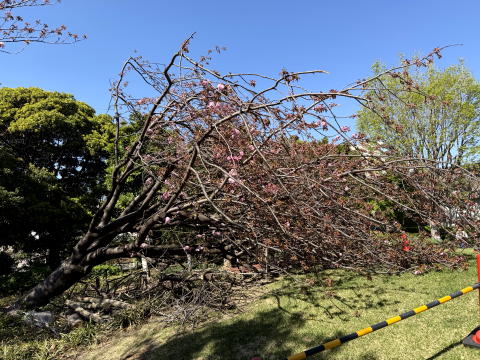 定食屋の帰りにマンション内の公園を通ったら、八重桜の大木が強風で根こそぎ倒れていました。