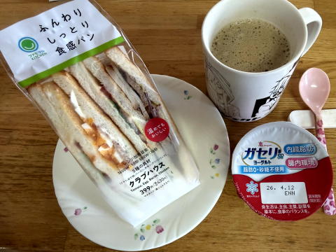 朝は、クラブハウスサンド、ヨーグルト、コーヒーでした。