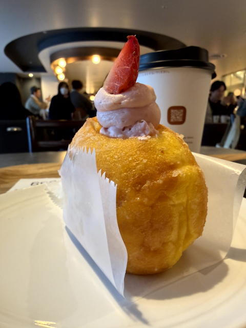生ドーナツのお店です。生ドーナツは、あんドーナツ(ドーナツ生地を揚げて、砂糖をまぶしたやつ)のあんこのかわりに、カスタードホイップクリームなどの生のクリームが詰まったドーナツです。いちごや抹茶などの種類があります。