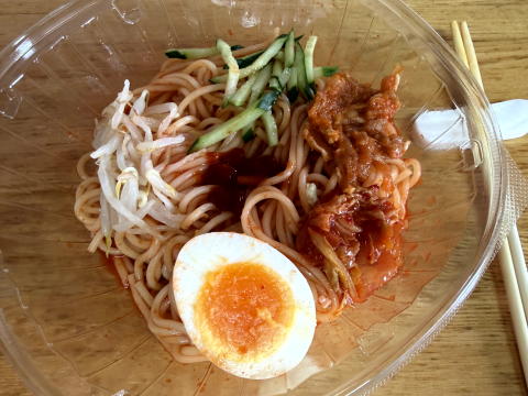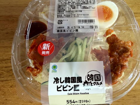 昼は、ファミマの 冷やし韓国風ビビン麺でした。辛い冷麺です。