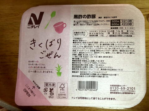 夜は、ニチレイフーズダイレクトの健康管理食(黒酢の酢豚)、海苔わさびふりかけでした。
