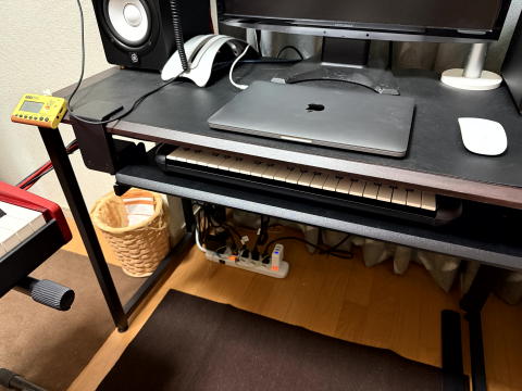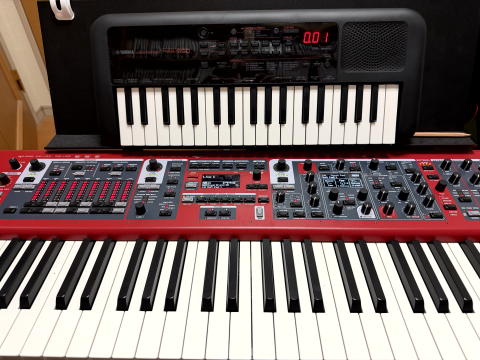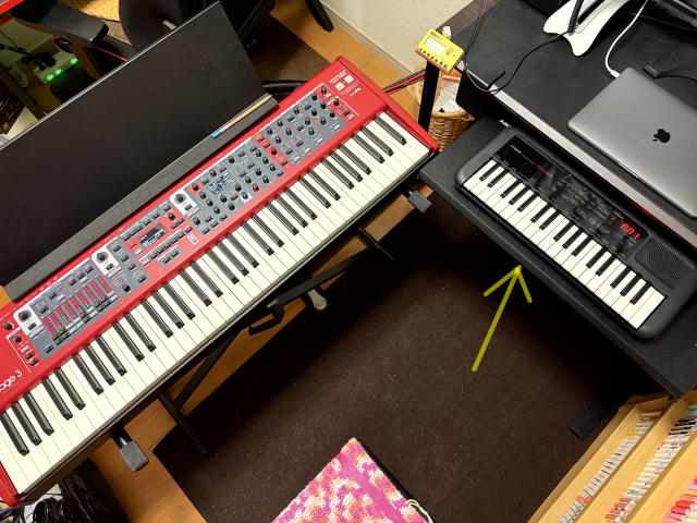 というわけで、拙宅の KORG microKEY 49をメルカリで売ってできたスペースに PSS-A50を設置しました。Nord Stage 3とPSS-A50は独立して操作し、アナログのオーディオミキサーの出力をスタジオモニターで鳴らしています。