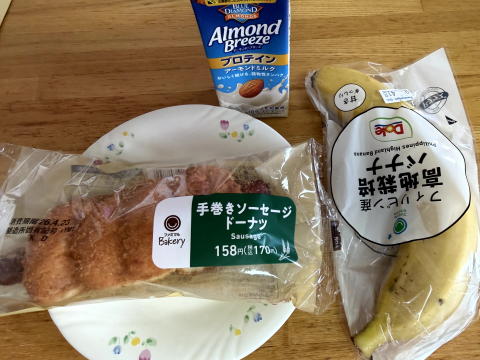 朝は、手巻きソーセージドーナツ、バナナ、アーモンドミルクでした。