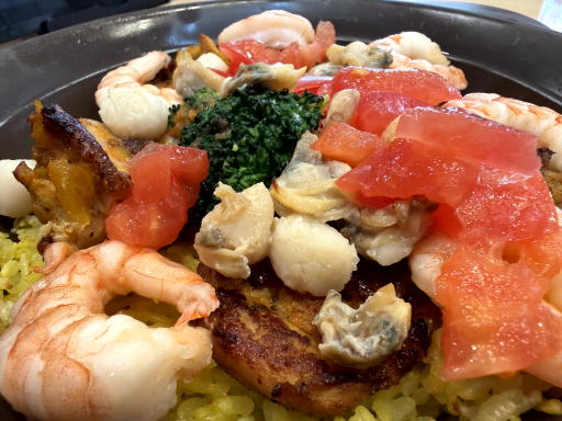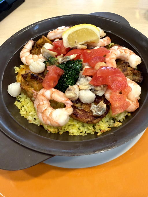 昼は、ジョナサンで季節のメニューから ハーブシュリンプとタンドリーチキンのパエリアダブル(具だけ2倍)を食べてみました。思ったより具が多い(特にタンドリーチキン)ので、ランチなら 具は 2倍でなくてもいいかもしれません。