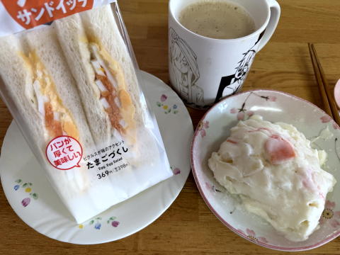 朝(11:30だが・・・)は、厚切りパンの たまごづくしサンド、ポテサラ、コーヒーでした。