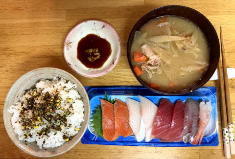 夜は、スーパーの お刺身(550円)と豚汁、ふりかけでした。