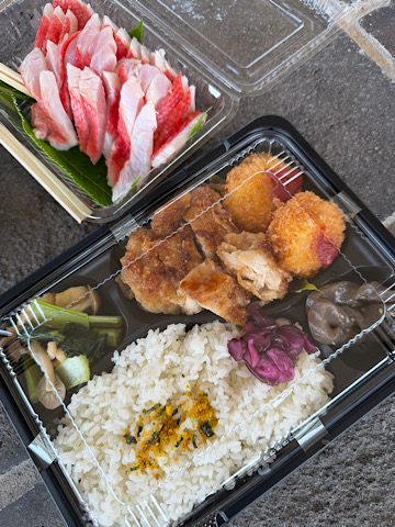 昼は、お弁当と、船長からのさしあれで、金目鯛刺身。