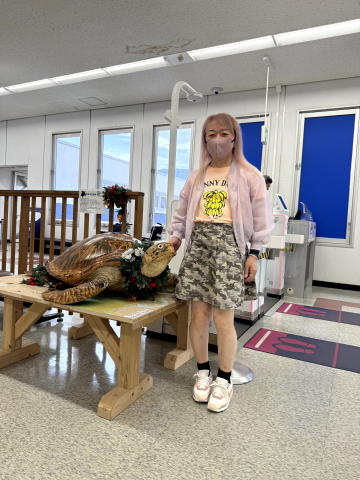 8:15に、ANA航空機移動組 3名は、八丈島空港へ移動してお土産を物色しました。空港に、木彫りのウミガメがありました。