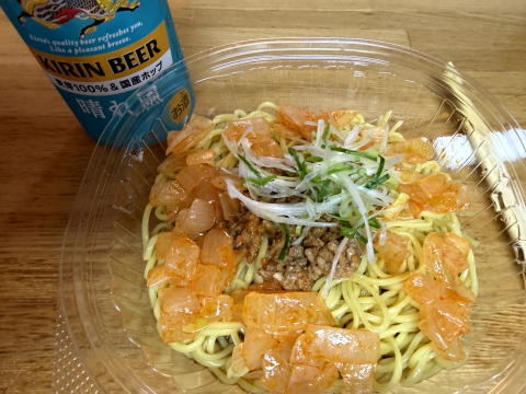 夜は、ファミマで 冷やし勝浦タンタンメン とビール。勝浦タンタンメン?! 初めて食べた。