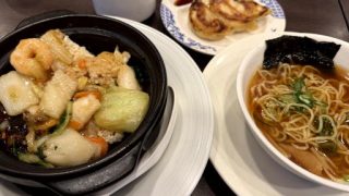 食べ物のこと じゅわーっ! 海鮮あんかけおこげ + 半ラーメン + 焼き餃子も 箱根駅伝は、青学おそるべし。復路でも新記録で優勝し、箱根駅伝3連覇。昼はバーミヤンで、海鮮あんかけおこげ、半ラーメン、焼き餃子でした。ねこ型ロボではなく、フロアスタッフがテーブルへ運んできて、客の目の前で、おこげに海鮮あんかけをかけてくれます。 2026-01-03 食べ物のこと