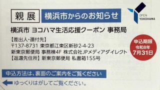 ふつうの日記 横浜市 横浜生活応援クーポン(ひとり 5,000円)ハガキきた~ 横浜市 横浜生活応援クーポン(19歳以上の横浜市民全員に、ひとり 5,000円)が届きました。たったの 5,000円だけど、もらえるものは素直に嬉しいね。 2026-04-27 ふつうの日記